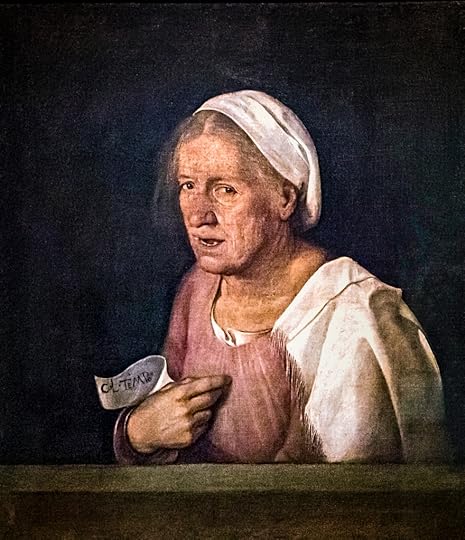 Uno dei quadri più fraintesi dal grande pubblico è la cosidetta Vecchia di Giorgione, dipinto a olio su tela (68×59 cm) ,che come tutti i quadri di questo pittore, ha una storia alquanto complicato: assieme a La Tempesta, questo dipinto apparteneva alla collezione di Gabriele Vendramin, anche se, stranamente, Michiel sembrerebbe non citarlo, benché l’opera appaia nell’inventario del 1528 della sua collezione, con il titolo di Testa di donna vecchia con un velo intorno al capo. Nel successivo inventario del 1569, fatto redigere da Luca Vendramin in occasione della trattativa di vendita – peraltro mai avvenuta – della collezione di famiglia al principe elettore Alberto V di Baviera, il quadro è citato come il ritratto de la madre del Zorzon, de man de Zorzon, cioè della madre di Giorgione, per mano di Giorgione, idea fantasiosa e romantica, che però, ci porteremo dietro per uno sproposito di tempo