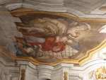 Il tutto, in una sorta di horror vacui, circondatda pitture con architetture effimere, trompe-l’œil, cartigli, conchiglie, finti stucchi, vele, festoni e ghirlande vegetali, ornati, cornici, nicchie con figure di Virtù, mensole, riccioli, volute e decorazioni con motivi a foglia d’acanto, quasi a sfidare la fantasia decorativa dei Serpotta e trasfigurare, in un ironico sberleffo, la pesantezza della materia.