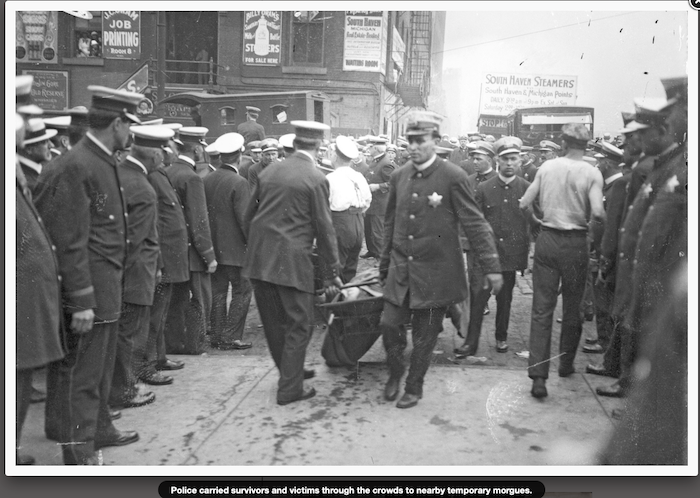A traffic patrolman, Walter P. Brooks, was just one of the policemen who spent 20 hours in the Chicago River rescuing people and removing the 844 dead passengers: 228 teenagers, 58 infants & toddlers. 70% of the dead were under 25 years old. Twenty-two entire families lost. Many families lost their only breadwinners. The horse-drawn trucks driven by Chicago police officers dutifully carried the dead to makeshift morgues. Bodies laid in rows of 95. Officers remained stalwart, listening to the wails of anguish as the living identified their loved ones.
