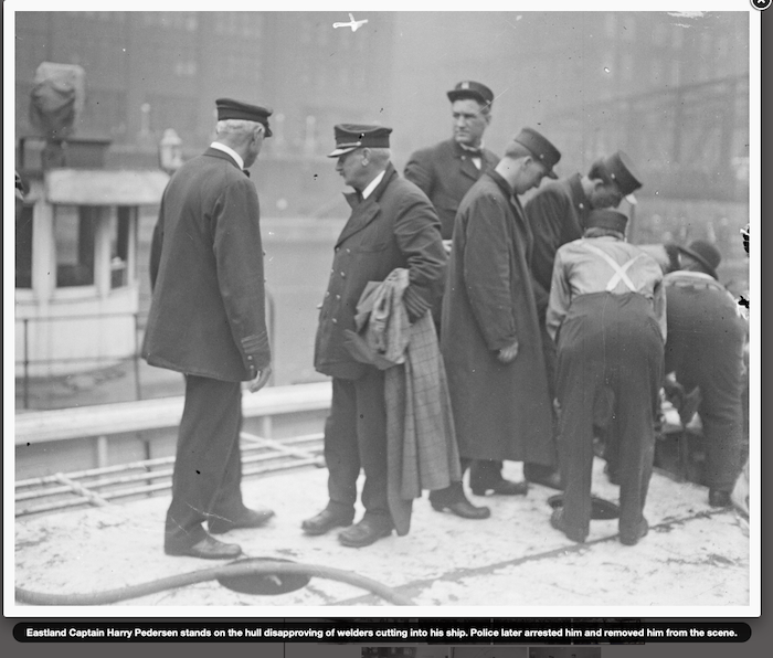Then came a cry. "They're ruining my ship! Order them to stop!" Eastland Captain Harry Pederson came shoving through the survivors as they limped and crawled to safety. He commanded the officers to stop the welders. Now forced to scream over the angry shouts from the onlookers: "They're ruining it!" Pederson grabbed at the welders. Officers arrested the enraged Captain. "Take him out of here!" A commanding officer ordered, knowing that if they kept the Captain here, he would indeed be attacked by an angry mob that was already calling for Pederson's blood.