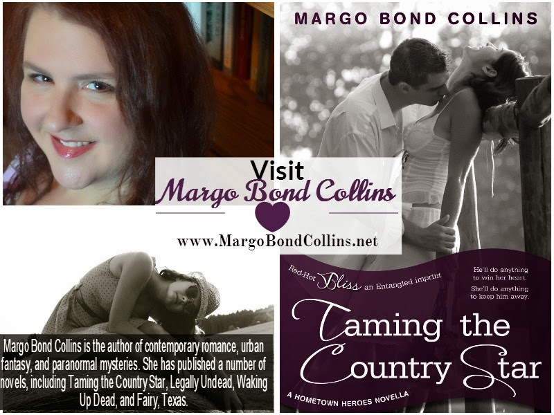 Margo Bond Collins is the author of contemporary romance, urban fantasy, and paranormal mysteries. She has published a number of novels, including Taming the Country Star, Legally Undead, Waking Up Dead, and Fairy, Texas. She lives in Texas with her husband, their daughter, and several spoiled pets. Although writing fiction is her first love, she also teaches college-level English courses online. She enjoys reading romance and paranormal fiction of any genre and spends most of her free time daydreaming about heroes, monsters, cowboys, and villains, and the strong women who love them. She currently writes for Entangled’s Red-Hot Bliss line.