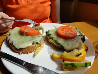 I had a spinach/walnut pesto on thick multigrain bread topped with swiss cheese and tomato. There were also slices of watermelon, cantaloupe and orange on the plate, but I'd already eaten those by the time we thought to take a picture. Oops.