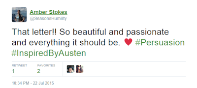 It's helpful to hear the reasons why Wentworth behaved the way he did throughout the book. And it's just lovely to know that his feelings for Anne remained, no matter how he tried to forget them or snuff them out.