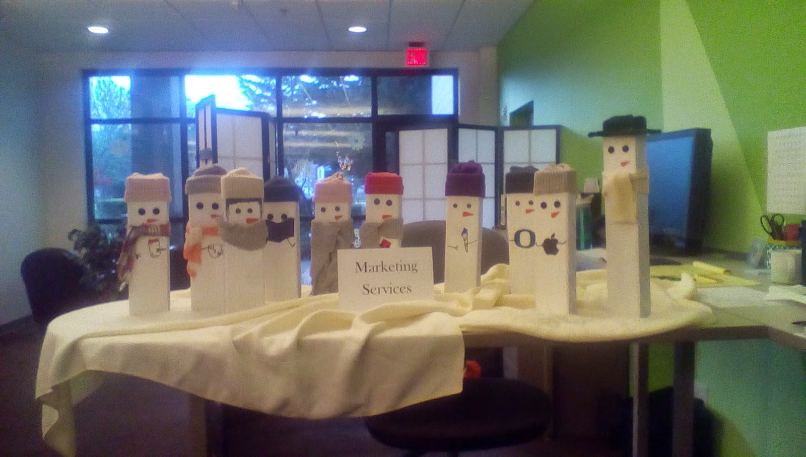 One of my good friends (who also became one of my coworkers at Harvest House!) created these fabulously cute snowmen, which represent the people in our department based on things we like and ways that we see one another.