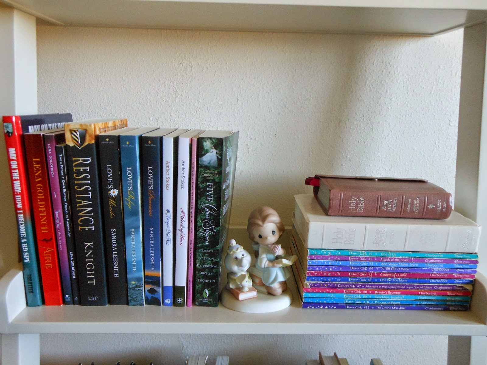 Some of the books I've edited, written, or publicized, along with the Disney Girls series (on their sides) and my Bibles on my bookcase in my apartment. :)