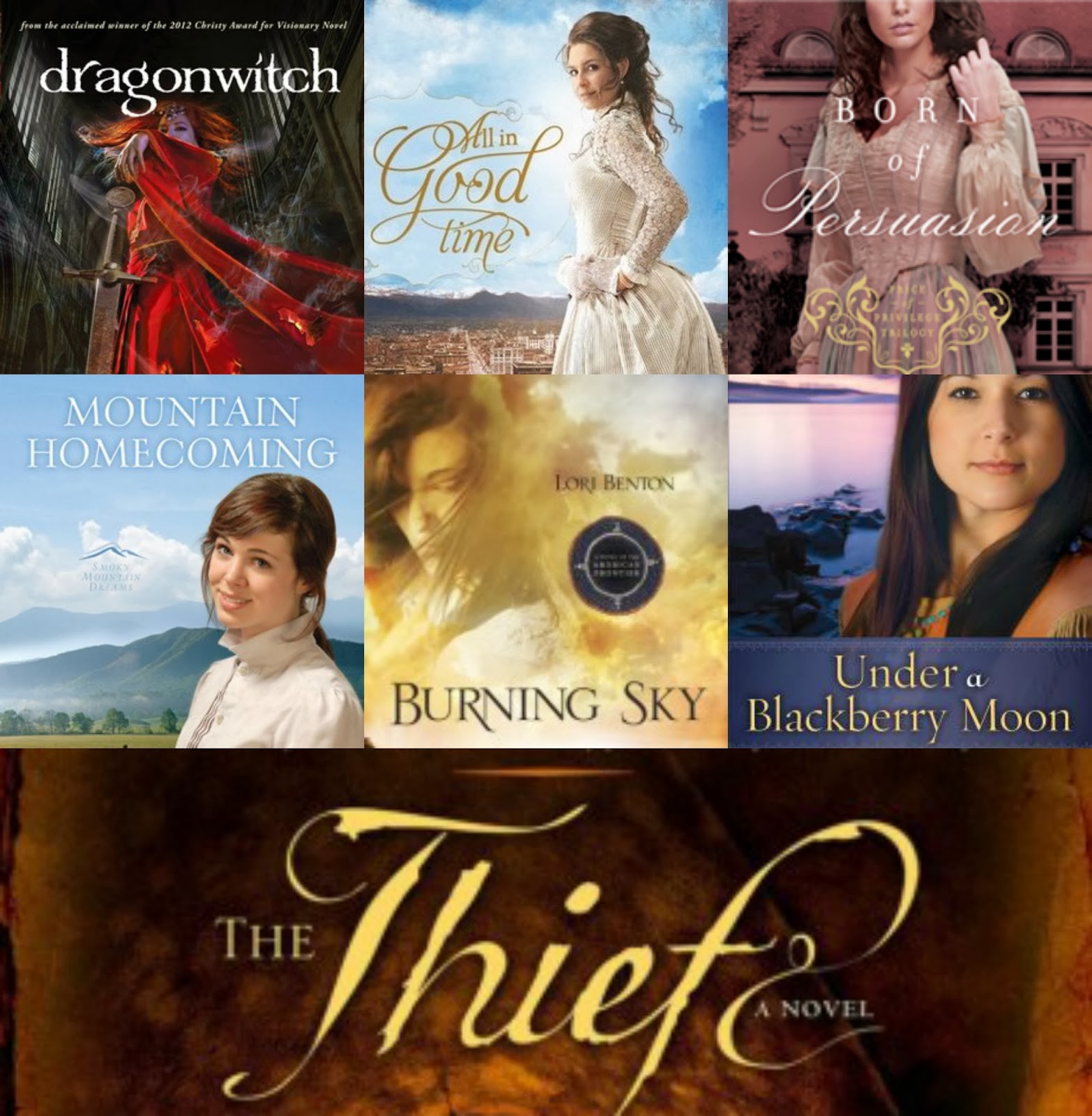 The books are: Dragonwitch by Anne Elisabeth Stengl (Bethany House), All in Good Time by Maureen Lang (Tyndale Blog Network), Born of Persuasion by Jessica Dotta (from author), Mountain Homecoming by Sandra Robbins (Harvest House), Burning Sky by Lori Benton (from author), Under a Blackberry Moon by Serena B. Miller (Goodreads First Reads giveaway), and The Thief by Stephanie Landsem (Litfuse Publicity Group).