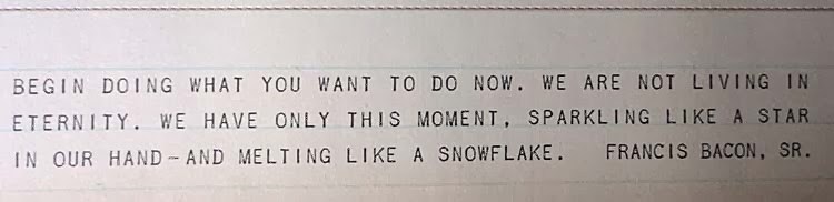"Begin doing what you want to do now. We are not living in eternity We have only this moment, sparkling like a star in our hand - and melting like a snowflake." ~ Sir Francis Bacon(Via Amy Hood Arts)I wouldn't necessarily say we aren't living in eternity, because I believe eternal life begins when we start our journey with God through faith in Him. But I like what this quote is really saying - that our time on earth, our time to make a difference here, is limited. So let the moment shine, and make it count before it melts away. (That doesn't mean we won't have seasons of waiting, of course! But there are always other things to do while we wait for one thing to come about, right?)
