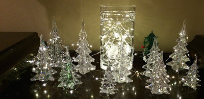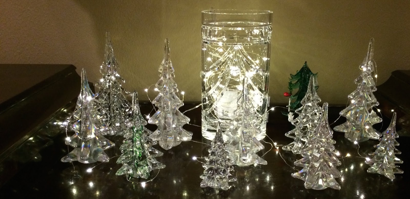 This year, I’ve especially enjoyed these little micro-lights that I found at Costco. You can get a pack of four for around $10, and they’re battery operated, so you don’t need a plug-in nearby. These little lights really do pack a punch and light up a nice area for their size. They also come with a multi-function feature, so they can blink, fade, and even change colors. They’re especially beautiful when placed around clear glass.