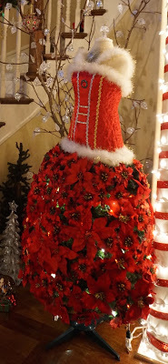 I simply took the top section of an old mannequin and put it on the bottom half of an old Christmas tree. (I believe I found both items at a thrift store.) Then I sewed a bustier for the mannequin top, though you could easily just pull a piece of fabric around for a top, and either glue, pin, or staple it in place. I added marabou (fake feathers) and other sparkly trim that can be found at a craft store. Once I had that in place, I plumped out the branches of the tree bottom, to create the skirt. I wound two strands of lights—one red and one white—through the branches. Finally, I used a glue gun to attach varying sizes of fake poinsettias to the outer branches. If you want more of a “tree” look, you can glue on fewer flowers. But I wanted a more concentrated look, so I actually glued 200 flowers onto my tree.