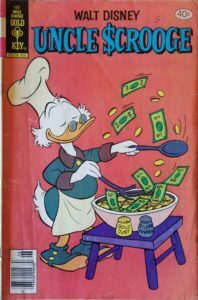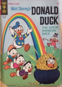 Even though nary a leprechaun is in sight, this is still a great cover for St. Patrick’s Day! A pot of gold, a colorful rainbow, and five of the best Disney ducks (sorry Magica De Spell, but you’re a villain!) puts us in the mood for cabbage and corned beef, does it not? And even though Uncle Scrooge McDuck would rather be celebrating Robert Burns night, on St. Paddy’s Day, everyone is Irish! There’s nothing fowl about the creative forces behind this issue of Donald Duck! So often these older comics aimed towards the young at heart didn’t credit those involved, but some of the writers and artists are known and listed at the Grand Comics Database, including Carl Barks, Tony Strobl, John Liggera, Bob Karp, Al Taliaferro, Steve Steere, and Jack Bradbury. Click the link to see a list of the stories and creators connected to each Disney adventure. The cover price of Donald Duck #105 is 12¢, while the current value is $48.