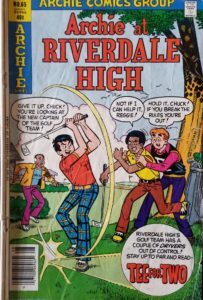 No one likes a show-off! When “Chance” Carter tries to weasel his way into becoming a member of The Archies, will his gimmick empress them enough to allow him to perform with the band? And speaking of show-offs, Reggie does whatever it takes to become captain of the golf team. Meanwhile, Reggie also seems to have lost his edge in track when Archie decides he doesn’t want to compete any longer. Yup, I dug this Archie comic out of a quarter bin and got to revisit the Seventies with the Riverdale gang! Unfortunately, many of the creators for this issue full of Riverdale antics and hijinks are unknown, but the Grand Comics Database (GCD) does list Joe Edwards, Mike Pellowski, Bob Bolling, Rudy Lapick, Barry Grossman, Bill Yoshida, and John Goldwater. Be sure to click the link for story titles and known credits. The cover price of Archie at Riverdale High #65 is 40¢, while the current values are $8 on CBR and $6 on ZKC.