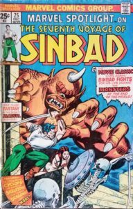 I had lots of fun reading this adaptation of The Seventh Voyage of Sinbad in Marvel Spotlight, mostly because it brings back childhood memories of watching both the movie and the Sinbad Jr. cartoon. I’m not sure if my previously owned back issue (which I was able to find in a quarter bin) is appreciated much today, but I was more than happy to give it a new home. And besides, my copy contains the coveted (and somewhat legendary) Marks Jewelers four-page insert. I’d heard about these a few years ago and thought I’d never own one, but now, thanks to digging through quarter boxes, I’ve added several to my collection. The cool creators of this issue of Marvel Spotlight are John Warner (writer), Sonny Trinidad (artist), Jim Novak (letterer), Petra Goldberg (colorist), Gil Kane (cover), Marv Wolfman (editor), and Kenneth Kole (screenplay from with this comic was adapted). The cover price of Marvel Spotlight #25 is 25¢, while the current value is $8.