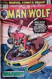 Quarter bin searches are one of my favorite things to do when it comes to comic books, but sometimes what comes home with me has missing pages, parts, and pieces. And this issue, of all things, is missing the last page! After discovering this horrible reality, what did I do? I searched the Internet like a creature on the loose and found a scan of the page I needed to read. Whew! I was then able to wipe the sweat off my brow. The Man-Wolf was in the first comic book I remember buying on my own, so even though my issue isn’t complete, I love having it as part of my collection. Creators on the loose for this issue include David Anthony Kraft (writer), George Pérez (pencils), Frank McLaughlin (inks), Dave Hunt (letters), Petra Goldberg (colors), and Len Wein (editor). Cover credits belong to Gil Kane (pencils), Tom Palmer (inks), George Roussos (colors), and Danny Crespi (letters). The cover price of Creatures on the Loose #35 is 25¢, while the current values are $12 on CBR and $10 on ZKC.