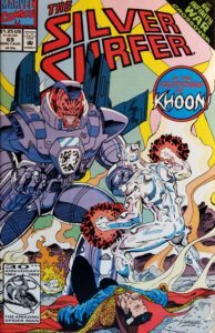 Oh boy! This cover doesn’t give Silver Surfer fans much hope, does it? No one in their right mind would want to be In the Clutches of Khoon! I was fortunate to find this Infinity War crossover issue featuring Norrin Radd in a quarter bin a few months ago, and while I have plenty of other Dynamically Discounted Cool Comics that have been stashed away in my basement for much longer, I couldn’t resist taking this trip back to the Nineties! Those responsible for taking us surfing through the cosmos include Ron Marz (writer), Kevin West (penciler), Tom Christopher (inker), Ken Bruzenak (letterer), Tom Vincent (colorist), and Craig Anderson (editor). The cover price of Silver Surfer #69 is $1.25, while the current value is $3. The Key Collector Comics value is also $3.
