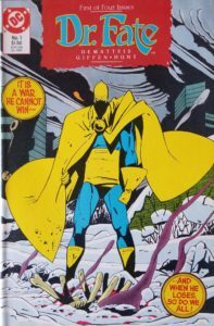 When you have a personal reason to read or buy a comic book, it often means so much more to you as a collector, and I have two such connections to this issue of Doctor Fate. First, the writer, J.M. DeMatteis, is someone I met in person at the Cincinnati Comic Expo 2018. I had him sign my Cool Comics In My Collection bag (I got some great signatures on it that weekend), which is pretty awesome. Second, my son recently gifted me a Doctor Fate Funko Pop 2021 Summer Convention Limited Edition figure, which is part of the Justice League series (#395 for those who like to know these things). And the Pop reminded me that I had this issue waiting for me in my file cabinet of unread adventures – and now no longer unread! Creative credits go to J.M. DeMatteis (writer), Keith Giffen (illustrator), Dave Hunt (inker), Agustin Mas (letterer), Anthony Tollin (colorist), and Denny O’Neil (editor). The cover price of Doctor Fate #1 is $1.50, while the current values are $4 on CBR and $3 on ZKC. The Key Collector Comics value is $3.