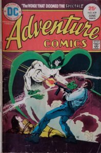 It’s a bit of a rare occurrence to stumble upon an issue of Adventure Comics in a quarter bin, but that’s exactly how I scored this ultra-cool comic featuring a stellar Spectre story, along with part 3 of a tale featuring Green Arrow and Speedy from an ongoing Seven Soldiers of Victory storyline. As many of you know, the Seventies is my favorite era of comics, and because I rarely read any DC issues during this period, finding them for so cheap is always a special occasion for me. This cool cover is by Jim Aparo (pencils, inks) and Tatjana Wood (colors). Interior credits for The Voice that Doomed…the Spectre include Michael Fleisher (script) and Jim Aparo (pencils, inks, letters), while Father Time’s Inn is brought to us by Joe Samachson (script), Lee Elias (pencils, inks), and Joe Letterese (letters). Joe Orlando and Paul Levitz are listed as editors. The cover price of Adventure Comics #439 is 25¢, while the current value is $45.
