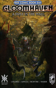 Perhaps it would have been helpful to better understand what’s going on in this Free Comic Book Day (FCBD) issue if I’d done a little research before reading it. And this is often the case when we try new companies and comic titles. We buy it (or get it for FCBD), pull it out of our stack to see what it’s about, and then end up being a bit lost. It’s based on a game (okay, so maybe you already knew that), and just learning this helped me a bit, even after the fact. When it comes to gaming, I may be clueless when it comes to Gloomhaven, but watch out if you dare take me on in Yahtzee or Sequence! Gloomhaven was created by Isaac Childres (editor). Other credits go to Travis Mcintire (writer), Tyler Sowles (art), Justin Birch (letters), Nolan Nasser (cover art), Price Johnson (editor), Josh McDowell (logo design), Joshua Werner (color & art assistance), and Phillip Gleason & Jacob Way (assistant editing & research). The cover price of Gloomhaven: A Hole in the Wall is free, while the current value is $1.