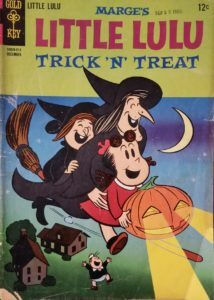 I’ve really come to love this section of the blog, especially when looking at seasonal comic book fun. In my opinion, there’s absolutely nothing wrong with adults reading comics aimed towards a younger crowd and being taken away from the worries and cares of the present for a few fleeting moments of fun childhood memories. This issue of Marge’s Little Lulu features a fantastic cover (and you’ll notice that mine isn’t in pristine condition, but I found it in a quarter box) showing our star hitching a ride on Halloween night, complete with a jack-o’-lantern headlamp. Inside, we get stories that will tickle your heart, such as Ol’ Witch Hazel and the Trip to the Moon, Little Itch’s Spell, Ol’ Witch Hazel and the Hungry Chimney Sweep, and A Rainy Day with Little Itch. Unfortunately, not much can be found concerning the creators, although John Stanley is credited with writing and penciling chores for several of the stories, along with Irving Tripp, who also gets credit on a few tales for pencils, inks, and letters. The cover price of Marge’s Little Lulu #178 is 12¢, while the current values are $35 on CBR and $30 on ZKC.