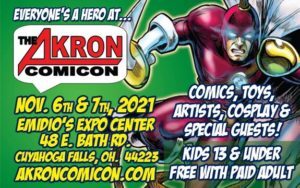 If you live in the greater Akron, Ohio, area (or if you’re willing to spend the gas money), don’t miss out on Akron Comicon this weekend! The doors will be open at Emidio’s Expo Center (see the image for the address and hours) Saturday and Sunday, November 6 and 7, with lots of great guests, exhibitors, special events, and panels. Be sure to check out the website at the link if you don’t want to miss out on guests like wrestling legend Sgt. Slaughter, Walking Dead actor W.F. Bell, Son of Ghoul, Mike W. Barr (Batman and the Outsiders), Tony Isabella (Black Lightning), Aaron Archer (Transformers), Dan Gorman (artist of the Cool Comics In My Collection logo!), Robert A. Kraus (Chakan!), Ted Sikora (Tap Dance Killer), and many more! I plan on attending November 7, so you may see me wandering around in a Cool Comics shirt!