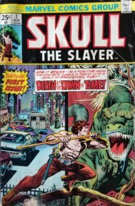 Recently, during one of my many archeological digs in quarter bins at my local comic shop, I uncovered this previously owned (and somewhat damaged) first issue of Skull the Slayer, a title that originally appeared during my early, impressionable years of collecting, but a comic that I didn’t give a second glance to back in those early days, because back then, capes and tights were my overriding passion. When I added it to my ever-growing pile of quarter comics, I didn’t notice the tear at the bottom of the cover, or the damage on the back, or the overall feel of a comic that’s lived through some harsh conditions. And on discovering all these faults once I got home and sorted my new treasures, I admit I was a little disappointed. Yet everything changed once I started reading it. No, it’s not the greatest of the Seventies titles, and yes, some of the dialogue will bother modern readers. But it will make you feel like you’ve traveled back in time and landed on the set of a crazy science fiction movie being filmed in 1975. The creative crew who gave us this wild story is comprised of Marv Wolfman (creator/writer/colorist), Steve Gan (artist), Marcos (letterer), and Len Wein (editor). The cover price of Skull the Slayer #1 is 25¢, while the current values are $25 on CBR and $14 on ZKC. The Key Collector Comics value is $18.