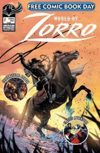 Zorro was created in 1919 by American writer Johnston McCulley, and the legend has grown strong over the years in print, radio, movies, television, and, of course, comic books. I’d never read any Zorro stories until I started buying the Topps Comics adventures back in the Nineties. And while Topps ceased publication long ago, American Mythology Productions is keeping the swashbuckling hero in print. If you’re not sure whether you’d enjoy Zorro comics, this Free Comic Book Day (FCBD) edition is the perfect way to find out. It features three sample stories (Zorro: Swords of Hell; Zorro: Legendary Adventures; and Zorro: Flights), along with The History of Zorro, which is a nice touch. Creators for this FCBD anthology include writers Mike Wolfer and Don McGregor, artists Allen Martinez and Vincenzo Carratu, and cover artist Mariana Puglia. The cover price of World of Zorro #1 is free, while the current value is $0.