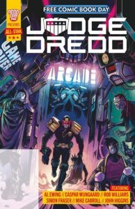 I wasn’t a Judge Dredd fan until I saw the 2012 movie Dredd, starring Karl Urban. Although to be fair, I hadn’t been reading any of his comics, so I didn’t know much about the character. A couple years ago or so, my son wanted to watch it with me, and though it’s a very dark world full of danger in a future that no one would want to be a part of, it’s a fascinating story. Still, I’ve probably read less issues than the number of fingers on either of my hands (and just for the record, I have four fingers and a thumb on each hand…at least that’s what I’m currently telling everyone). When I’m fortunate enough to spot Judge Dredd comics in quarter boxes, I purchase all that I find, including some past Free Comic Book Day (FCBD) issues. At some point I’ll start reading them, but I do enjoy building up my runs before digging in. But I read a FCBD issue each week, and I didn’t wait too long before pulling this one out to enjoy. This special issue comes with three stories: Judge Dredd – The Lawyer (writer: Al Ewing; artist: Caspar Wjingaard; letterer: Simon Bowland); Hershey (writer: Rob Williams; artist: Simon Fraser; letterer: Simon Bowland); and Dreadnaughts (writer: Michael Carroll; artist: John Higgins; Colors: Sally Hurst; letterer: Simon Bowland). The cover price of All-Star Judge Dredd is free, while the current value is $1.