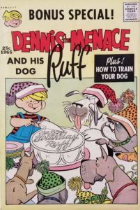Like so many older comic books, the name on the cover doesn’t match the series title (which isn’t even listed in the indicia…yet the issue number is listed there), but to top it all off, this is a reprint of #14, which came out just three years before this one. I guess they figured that most Dennis the Menace readers who had the earlier version had already graduated to more sophisticated titles. Still, this extra thick issue was a great value back then, and Fawcett gave readers seven complete stories, along with activity and coloring pages, and a section about training your dog. I was fortunate to find a copy listed in Fair condition for just $2. Ruff certainly isn’t my favorite comic book/comic strip dog, but I do enjoy seeing Dennis, his family, and pals sometimes, as these characters make me think back fondly on my childhood. I couldn’t find any creators listed for this issue, and I don’t know if the creator of Dennis the Menace, Hank Ketchum, had a hand in the comic books or not. Perhaps one of you readers know and would like to inform us in the comments section below? The cover price of Dennis the Menace Giant #34 is 25¢, while the current value is $35.