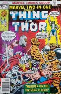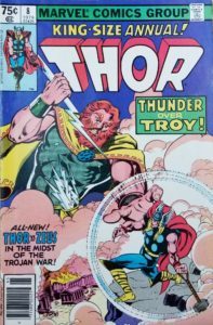 I’m excited that I’ve made a bit of a change to this Cool Comics category, because I have a couple short boxes full of comics that were given to me for free, along with lots of other comics that I obtained for more than a quarter that were still great purchases. Yet there’s no denying that this featured comic comes to us right out of a quarter bin, one in which I’d been recently digging (in other words, just a few short weeks ago!). Thor is one of my favorite heroes, and when this annual that had never found its way into my collection appeared before my eyes in that bargain box, well…it had me at THOR! Roy Thomas and John Buscema give us this rousing tale aptly titled THUNDER OVER TROY, an issue not to be missed by fans of Homer’s classics The Iliad and The Odyssey (sorry Simpson’s fans, but it wasn’t THAT Homer). The course is set in this Homeric tale by the machinations of that rascal Loki, but would we have it any other way? Verily, this comic book be worthy! The cover price of Thor Annual #8 is 75¢, while the current value is $12. The OPG value is $14.