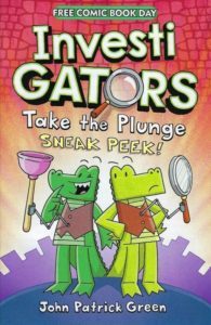 This Free Comic Book Day (FCBD) issue by creator John Patrick Green dares us to “Take the Plunge” into this sneak peek of his InvestiGators graphic novel. I appreciate the clever use of a plunger and magnifying glass as tools of choice of his two InvestiGators on the cover, giving us a bit of an idea that Green intends this to be a fun adventure, regardless of the age of the reader. Obviously, a younger audience is more apt to be interested in the capers of these two intelligent, crime-solving alligators, but it proved to be a fun adventure for someone like myself, whose sweet-spot of comic books resides in the Seventies. But the beauty of FCBD is that it allows us to sample something different at no cost. And if you like it, there’s more adventure waiting for you. The cover price of InvestiGators is free, while the current value is $1.