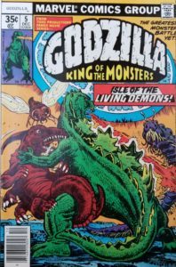 Did you see Godzilla vs. Kong yet? Unfortunately, I haven’t gotten around to it yet, but I did see the 1962 film King Kong vs. Godzilla one late Saturday night in the Seventies when I was a kid. According to the website Box Office Mojo, the new version has pulled in nearly $340 million, which seems pretty good considering COVID-19 is still with us. But I don’t even need to go to the theater, because it’s also showing on HBO Max (which I have), so I really need to commit to watching it soon! In the meantime, I pulled out this classic issue of Godzilla from my file cabinet of unexplored comic book adventures. This issue is kind of special because it contains a fan letter from John Buntin, Jr., the owner of local comic shop Kenmore Komics & Games, a store that still has quarter bins! If you’ve never read any of these old Godzilla issues from the Seventies, you might be surprised to find out that S.H.I.E.L.D. is involved, with Dum Dum Dugan heading up the Godzilla Squad. These comics are a lot of fun! This issue of giant monster goodness is brought to us by Doug Moench (writer), Tom Sutton (artist), Klaus Janson (inker), J. Costanza (letterer), Phil Rache (colorist), and Archie Goodwin (editor). The cover price of Godzilla #5 is 35¢, while the current value is $16. The OPG value is also $16.