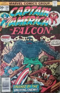 If you’re a fan of Jack Kirby—and even if you aren’t—you are probably well aware that he’s the co-creator and original artist of Captain America. Back in the early days (The Golden Age) when Marvel was a company named Timely, writer Joe Simon and artist Jack Kirby gave the world the star-spangled hero in 1941, several months before the USA entered World War II. And now, when you think about it, how neat is it that Kirby was writing, drawing, and editing Captain America during our Bicentennial? This issue, featuring the villain Agron, puts us in the middle of a story that certainly makes more sense if you’ve been reading this title sequentially, but if you happen to run across this issue, don’t let that stop you from buying it…especially if you run across it in a quarter bin, like I did. I was getting Captain America every month for a while in the mid-Seventies, and during part of 1976, but for some crazy reason I stopped for a while and missed out on this issue. But that’s been rectified now, and much to my delight, because reading this was a blast! I’m excited for you to read it, too, because the Falcon is…okay, hold on, wait just a minute…I’m not going to spoil this comic for you, even though it’s nearly 45 years old. The cover price of Captain America #204 is 30¢, while the current value is $14. The OPG value is also $14.