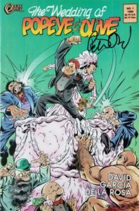 This special wedding edition of Popeye and Olive Oil is full of the fun and history of the sailor man himself, from goons to the wiffle hen! Popeye cartoons were often aired and often repeated during my childhood, and to me they were a constant source of entertainment. Though this version of the brawny spinach eater has a much shaggier head of hair, if you’ve got a history of reading or watching any of his adventures, this comic is one you may want to add to your collection. Lucky for me I just so happened to find it in a quarter bin! But that’s not all, folks. Notice the signature just below Olive’s name on the cover? Yes indeed, it appears to have been autographed by the writer himself, Peter David (yes, THAT Peter David). I looked up some of David’s signatures online, and this looks like it’s the real deal. I’d never heard of the company before (Ocean Comics), but I’m glad they decided to publish this fun wedding issue. The cover price of The Wedding of Popeye and Olive #1 is $2.75, while the current value is $3.