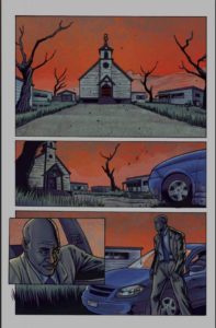 The synergy on display between Martinez’s art and Trevor Richardson’s colors is incredible. The splash page that reveals cult leader Renfield is especially exquisite. It balances the gravitas the character brings to the story yet also perfectly depicts the weightlessness Renfield carries himself with. All before mentioning the easily overlooked but must be noted work that Richardson has added to the skylines of the panels. Outside the compound, Richardson’s use of rich bold reds resembles the color of fresh, flowing blood. It creates a foreboding atmosphere very well.