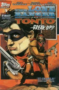 What? According to the cover, this crime fighting duo from the old west break up! Could it be that they’re just practicing good social distancing? When teams and groups break up, it tugs at the old heartstrings, doesn’t it? First, we had to deal the end of Martin and Lewis, then the Beatles called it quits, and now The Lone Ranger and Tonto are no more? Life as a fan isn’t always easy. Sigh. Anyway, this comic that I found in a quarter bin was published by Topps Comics. Maybe some of you remember when the company famous for sports cards and sometimes non-sports cards dipped their toes into the comic book arena from 1993-1998. They put out a Kirbyverse line (yes, Jack Kirby…and a few famous comic creators were involved in these besides Jack, such as Kurt Busiek, Gerry Conway, Tony Isabella, Steve Ditko, and Don Heck, to name a few); literary comics that included Dracula, Elric, and Zorro; movie adaptations such as Jurassic Park and James Bond; TV adaptations like the X-Files and Xena; and lots more. Some of the stuff was pretty good and entertaining, although I don’t think many people search for back issues of this line today. But I liked it at the time and wouldn’t mind adding a few more to my collection. This issue was written by Joe R. Lansdale (yes, the same one who writes those fantastic novels), with art by Timothy Truman. If you’re a Lone Ranger fan, this is a Topps Comics series you could put in your collection. By the way, if you missed episode 235 of Cool Comics (it’s never too late to go back in time and read it!), make sure to check it out, because you’ll find more love for The Lone Ranger in our new Cool Comics Reader Reviews category. The cover price of The Lone Ranger and Tonto #1 is $2.50, while the current value is $3.
