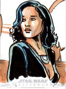 This episode’s creation comes to us from illustrator Dan Gorman, a member of the National Cartoonists Society and one of the top sketch card artists on the planet. This card featuring Qi’ra from the Han Solo movie is one of the 50 plus sketch cards Dan created for the Topps Star Wars Masterworks 2019 Set. For more about Dan and his art, please visit www.dangormanart.com.