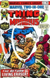 Morbius versus the Thing versus the Living Eraser! Can it get more Seventies than this issue of Marvel Two-In-One? Perhaps some of you out there are excited to see yet another appearance of The Living Vampire, because a new Morbius series just hit the streets yesterday (make sure to tune in to next week’s Cool Comics episode for coverage of Morbius #1!), and now that you’re big fans, you want more-bius (it’s okay, you can groan at that one). And who doesn’t? Well, maybe not the Ever-Lovin’ Blue-Eyed Thing, who happens to find Michael Morbius about to make a late-night snack out of Alicia Masters, Ben Grimm’s longtime girlfriend. After the Thing chases away Morbius, this story gets really whacky when the Living Eraser shows up and seemingly erases them both out of existence! This is a fun issue that you don’t want to miss out on if you love these crazy Seventies mashups. The cover price of Marvel Two-In-One #15 is 25¢, while the current value is $10.