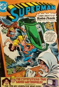 Anyone else out there in comicbook land get a kick out of advertising giveaways featuring big-time superheroes? I used to have a few more in my collection, but when I had a ginormous garage sale and sold thousands of comics at bargain bin prices, I cleared space by getting rid of most of them. Now, since I’ve been searching through quarter bins once more, I’ve struck advertisement giveaway gold all over again (and to prove it, I’ll have another in this same spot next episode!). Though Radio Shack is now, sadly, a thing of the past, we can remember everyone’s favorite electronics paradise through Stranger Things (you know, the hit show on Netflix), Trekkies (remember the guy who built his own Captain Pike chair and drove it to his local Radio Shack?), and this “Super” free comic that features your favorite computer from yesteryear, the TRS-80! The Man of Steel teams up with a couple youngsters and together they save the day! Do you have a favorite advertising freebie? Let us know in the comments. The cover price of Superman: Radio Shack Giveaways: 1980 is free, while the current values are $8 on CBR and $10 on ZKC.