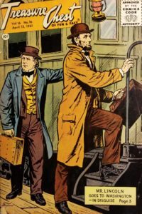 Many moons ago, I went to a special dollar sale and grabbed as many old comics as I could find. I did pretty well as I squeezed through the crowd and came up with about 50 comic books that I thought would be interesting to feature here in Cool Comics. I was familiar with many of the titles I bought that day, but there were a few, like this Treasure Chest comic, that I’d never seen or heard of before. But hey, if Abe Lincoln is on the cover, you better believe I’m buying it (yes, I’m a history junkie). Anyway, it turns out that this comic was produced in Dayton, Ohio, and published every two weeks during the school year, from 1946 until 1972. George A. Pflaum also put out the Young Catholic Messenger, Junior Catholic Messenger, and Our Little Messenger. I wonder if any readers out there who went to a Catholic school remember Treasure Chest or any of the other publications. Anyway, this comic has a story about Abe Lincoln (he proclaimed, in 1863, that the country would celebrate a national Thanksgiving Holiday, so the timing of this issue in the blog is perfect!), some puzzles, a continuing adventure tale, articles for a younger crowd, some comic shorts, information about snorkeling and then a comic featuring snorkeling, a short called “The Mass: The Consecration and Elevation,” and then a short comic about a Polish hero who also was also involved in the American Revolution. It’s jam-packed with stuff that kids probably enjoyed reading back then. I know I had fun with it. The cover price of Treasure Chest Vol. 16, No. 16 is 10¢, while the current values are $38 on CBR and $35 on ZKC.