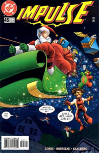 What? Cool Comics Done Dirt Cheap? Wasn’t this category supposed to be finished? Well, I believe I did say that there was a slight possibility it could be resurrected for some one-offs, and such is the case with this issue of Impulse. And being that it’s the month of December and the cover of this comic fits in with the holiday season, well, it all makes sense now, doesn’t it? And yet it was also a mistake (sort of like last episode’s Fantastic Four entry). I’d moved this issue from my legendary longbox into my file cabinet of unread comics so that I wouldn’t miss it for Christmas … and then I completely forgot about it until now. As to the comic itself, Santa Claus doesn’t even appear inside, although Impulse’s mom travels from the future to visit Bart for the holidays, crazy stuff happens with some not-quite-super-villains, and all’s well that ends well. The cover price of Impulse #45 is $2.25, while the current value is $3.