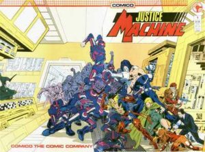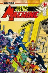 talented comic writers and artists, and every once-in-a-while I find signed books in local quarter bins. Justice Machine is not a comic I’m familiar with (lots of stuff came out in the Eighties that I’m still discovering), but it was fun reading it, since I’ve met both Tony (on several occasions) and Mike, and I look forward to reading the other copies I’ve added to my collection. By the way, this issue contains a gatefold cover, which you can see in the additional image. The cover price of Justice Machine #1 is $1.50, while the current value is $3.