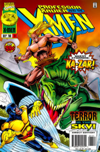 This week my legendary longbox (over a year ago, I bought a longbox that was stuffed with 419 comic books for just $20; hence, Cool Comics Done Dirt Cheap) takes us on an adventure to The Savage Land! Back in the Nineties, Marvel tried giving younger readers a less expensive way to get involved with the hobby, presenting older stories told in a new way, from a different perspective. Hence, we get the “classic” X-Men team, but with a modernized storytelling method. I remember back when this series originally came out (alas, it lasted just 18 issues) and thought it was a great idea, but not enough people got onboard. Still, you can find these in discount bins if you want to collect them for yourself or perhaps for some of the comic-loving kids in your life. The cover price of Professor Xavier and the X-Men #11 is 99¢, while the current value is $3.