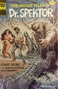 A few weeks ago, I decided to flip through some back issues of horror titles at my local comic shop. It was early October, and while I have plenty of good scary stuff I can use during the month, I found the first issue of Supernatural Thrillers at a great price and couldn’t resist. The story, by Roy Thomas, is adapted from a piece of short fiction by Theodore Sturgeon, a name familiar to many readers of Science Fiction, Horror, and Fantasy, and features a swamp creature. Again. At last count, I’ve had four swamp creatures in Cool Comics since episode 159: Swamp Thing, Man-Thing, the Lurker of the Swamp from The Occult Files of Dr. Spektor, and now It (“The Thing That Couldn’t Die!” according to the cover). So the question for the day is, has anyone ever dressed up like a swamp creature for Halloween? If you have, please let us know in the comments! The cover price of Supernatural Thrillers #1 is 20¢, while the current values are $45 on CBR and $30 on ZKC.