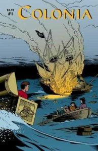 When I pulled this completely unfamiliar title out of my legendary longbox (I bought a longbox that was stuffed with 419 comic books for just $20 a while ago; hence, Cool Comics Done Dirt Cheap), at first glance I thought it was going to be based on something in history. And I like history, so I was okay with that. But my first clue that things were a little cockeyed here should have been the kid riding in a treasure chest. When we start reading, the captain and his crew will make you think of pirates, but soon we see some people dressed in ordinary modern-day clothes. And all vestiges of common sense fly out the window when Jack, the boy in the treasure chest, sees a fishman…or a man made up of several fish…walking around on an island. There’s also a duck that talks, but that’s nothing new to comic book readers, right? Jeff Nicholson, who both wrote and illustrated this unusual black and white tale, takes us on a trip that would make Alice (in Wonderland…or Through the Looking Glass) proud. This is the only issue I have, and while I’m not on a search to find more, if I stumbled upon them while scouring through quarter boxes, I’d purchase them to find out more about what is going on. The cover price of Colonia #1 is $2.95, while the current value is $3.