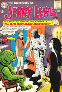 I learned about The Adventures of Jerry Lewis from an article in the most recent issue of Hogan’s Alley magazine (# 22) and knew that I needed to add some to my collection. The article is very informative, explaining how it started off as The Adventures of Dean Martin and Jerry Lewis, and just like their Hollywood split, the comic book relationship also came to a close. Why do I care about Jerry Lewis comic books? Because like so many of you, I grew up watching his zany antics on television, way back in the days when it was pretty easy to find lots of cool things to watch on a Saturday afternoon…or evening. Kids in the neighborhood would ask each other if they watched Jerry Lewis movies that happened to be on TV over the weekend, and we’d talk about our favorite goofy scenes. Jerry seemed like a pretty good guy, and we’d all try to catch lots of coverage of his famous MDA Labor Day Telethons each year. Simply put, he was part of my childhood, and when I found out about his comic books, it was a no-brainer. Since I like certain kinds of monsters, this issue is one that I wanted to add to my collection. The cover price of The Adventures of Jerry Lewis #87 is 12¢, while the current value is $85.