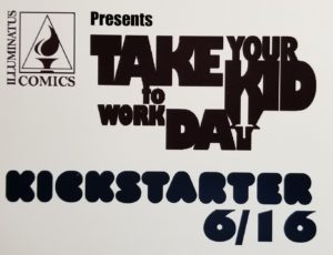 A postcard I received about the campaign.Comic books on Kickstarter (and other platforms) are sort of like Indie Publishing for books (which I’ve taken part in), and when we can support them at Cool Comics, we do so, and like to let the readers out there know about them, too. Illuminatus Comics currently has a campaign for their comic, “Take Your Kid to Work Day.” After just a few days, I’m happy to report that this Kickstarter is already near goal! But they have stretch goals, too, with all sorts of cool items that donors can receive if those goals are met. If you love comic books and appreciate all the hard work that goes into creating them, please click on the linked-title above, check out what this campaign is all about, and consider supporting Illuminatus Comics.