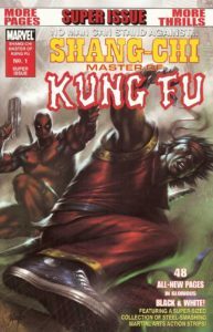 Marvel’s Master of Kung Fu holds a certain mystique (no, not the blue one!) in my mind. It’s nothing I can really lay my finger on, yet it’s there. I remember seeing comics and the black and white magazines he was featured in when I was growing up in the Seventies, yet I never read them. But when I went to college, I got a few issues my freshman year and liked what I read. Yet my days of reading comics while a college student didn’t last long, and they were all packed away until I started collecting again in 1993. Still, Shang-Chi was pretty absent in Marvel until a mini-series came out in 2002, which I did get, but it didn’t feel the same as the early Eighties ongoing series. And neither did this black and white one-shot comic I picked up for just 50 cents. Elements were there, especially after the first story (which was an odd, yet somewhat entertaining team-up with Deadpool), but it wasn’t the same. Which makes me glad that I can still find issues of the original series for decent prices when I’m fondly remembering the past. The cover price of Shang-Chi: Master of Kung-Fu #1 is $3.99, while the current value is $4.