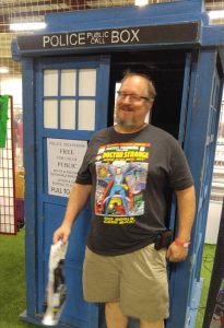 Some of the stuff I really enjoyed seeing were items from my childhood, such as Topps Planet of the Apes trading cards and a Lite-Brite in the original box! It was like taking a ride in the TARDIS and visiting my childhood years (I look a little wibbly wobbly in the picture, don’t I?). There were all kinds of toys and action figures galore, from current times to several decades old. It was definitely a cool place to be for a person like me!
