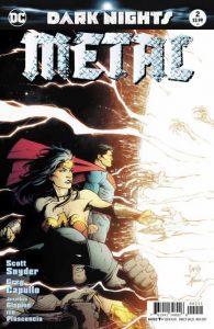 I’ve covered a few Futures End titles here in cool comics, but each of them seemed to go with a specific ongoing series. I hadn’t realized Futures End also had its own ongoing series that ran 48 issues. This particular issue features Batman Beyond, Big Barda, and Emiko. I believe this is the first comic I’ve read with Batman Beyond, although I’m familiar with him. Emiko was completely new to me, being that she had her first appearance a decade after I’d gone cold turkey on comic books. With these factors in mind, and considering that all the Futures End titles take place five years in the future from when they were written, and factoring in that this is issue 13 and I missed a bunch of what happened previously, it was a decent read. If you’re a fan of the New 52, or wonder if it’s still relevant after Rebirth, perhaps the answer lies somewhere outside the “52” multiverses. Which takes us to Dark Nights: Metal #1, directly below. The cover price of The New 52: Futures End #13 is $2.99, while the current value is $3.