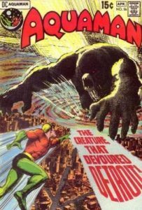 For all the thousands of comic books I’ve read and owned in my lifetime, this is just the 18th issue of Aquaman I’ve ever bought. And it’s definitely the oldest. I’ve read other comics in which Aquaman has played a part (variations of Justice League, Brave and the Bold, etc.), but the only time I bought his comic regularly was in the Nineties, when he got the hook. I may have lost some of you there, but you can do a search and find out for yourself. I had issues 0 through 15, and while I enjoyed the story, at different times in my life I would quit reading titles for various reasons, so my collection wasn’t big. And now this is the only Aquaman I own. All the others were sold at my legendary garage sale a few years back (Anyone who was there and participated in my fantastic deals is sure to refer to it as legendary!). So why Aquaman now? Cool Comics Classics is a section I look forward to writing each week, because more often than not, I’m covering books from the Seventies, like this issue, and I LOVE Seventies comics. Also, I want to have classic characters in my collection, so it was about time to add one of his titles. This comic also has an interesting history, as it was the last issue of Aquaman until they restarted the series back up in 1977, and decided to follow the same numbering system. So if you have issue 57, that’s why there is about a six year gap in between. By the way, things aren’t going well in Detroit in this issue. That’s a city not often visited in the comic book world. The cover price of Aquaman #56 is 15¢, while the current value is $45.