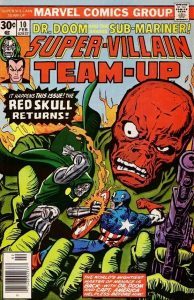 If you’re reading this, then you probably love superheroes as much as I do. But where would our heroes be without supervillains? Granted, most of us cheer for the good guys (hopefully!), but every hero needs a foil. Right there on the cover you see a giant head of the Red Skull, with a much smaller Captain America in the palm of his hand. It’s hard to see one without thinking of the other! If I say “Lex Luthor,” who comes to mind? Of course, Superman. Popular heroes tend to have fantastic rogues galleries to do battle with, Batman and Spider-Man having some of the best in the business. Now some of you might be saying, “Hey, didn’t this guy just tell us above that Namor is a hero? And here he is, pictured with Doctor Doom and in a Super-Villain comic book.” Yes, that’s all true. But where Namor is concerned, it’s all a matter of perspective. As Prince of Atlantis, his people always come first. He’s fought often against the Fantastic Four, as well as in partnership with the Fantastic Four. Thought this series lasted just 17 issues, it features great covers and fun stories you may just want to collect. The cover price of Super-Villain Team-Up #10 is 30 cents, while the current value is $16.